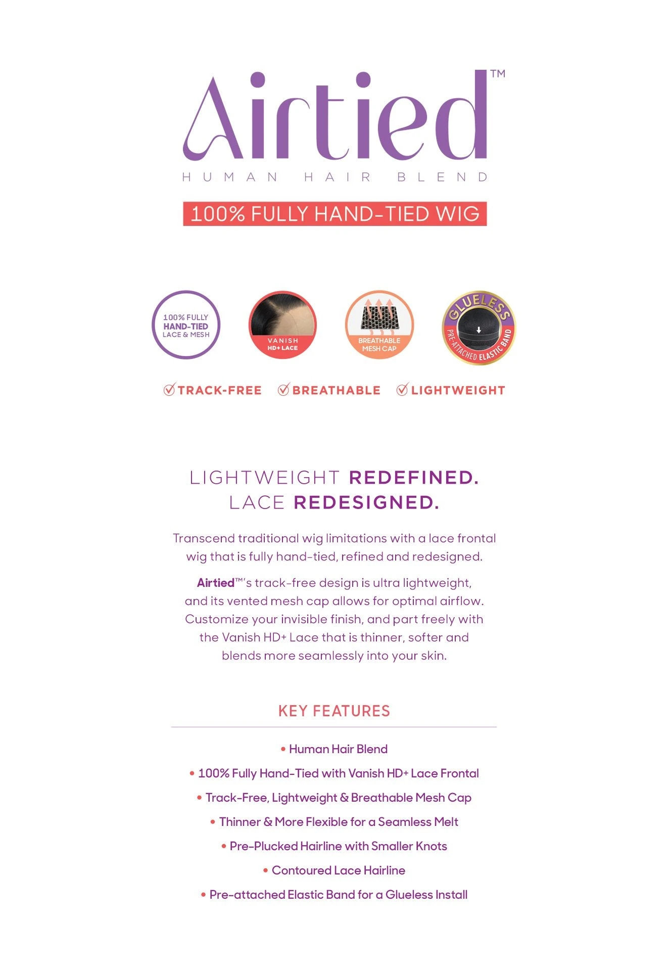 - Transcend traditional wig limitations with a lace frontal wig that is fully hand-tied, refined, and redesigned. Airtied’s track-free design is ultra-lightweight, and its vented mesh cap allows for optimal airflow. Customize your invisible finish, and part freely with the Vanish HD+ Lace that is thinner, softer, and blends more seamlessly into your skin.